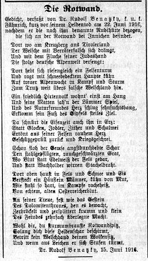 Rudolf Benatzky wurde am 20. Juni 1888 als Sohn des Fachlehrers Rudolf Benatzky und seiner Frau Antonia Augustina, geborene Wagner, in Hallein (Salzburg) geboren. Nach dem Studium am Kollegium Borromäum wandte er sich der Philosophie mit den Hauptfächern deutsche und französische Sprache zu. Er war Mitglied der katholischen Studentenverbindung "Norica". Nach Beendigung seiner Studien und der Promotion zum Doktor sowie der Ablegung der Professorenprüfung trat er eine Stellung als Supplent am Staatsgymnasium in Wiener Neustadt an. Zu Kriegsbeginn hatte Dr. Benatzky gerade eine fixe Stelle als Professor an der Lehranstalt in Waidhofen an der Thaya erhalten. Am 30. November 1914 wurde Rudolf Benatzky assentiert und meldete sich als Kriegsfreiwilliger zur "Einjährig-Freiwilligen" Ausbildung zum Reserveoffizier, die er anfänglich in der Wehrgrabenschule in Steyer (Oberösterreich) absolvierte. Am 30. August 1915 ging er, per 1. August 1915 zum Fähnrich der Reserve (Rang: 5362) befördert, zum k.u.k. Infanterie Regiment Nr. 59 an die Front ab. Hier wurde Dr. Benatzky dem Alpendetachement des Oberleutnants Bruckner zugeteilt und war von Beginn an, wie beim Rainer-Regiment wohl üblich, in schwere Kämpfe verwickelt. Im Rainer-Buch findet sich über ihn folgender Eintrag: "Daß die in anderen Verbänden stehenden Rainer überall voll ihre Pflicht taten, ist selbstverständlich. Ganz hervorragend bestätigte sich Fhnr. Dr. Benatzky beim Alpendetachement Bruckner. Er zeichnete sich im Frühjahr 1916 bei der Verteidigung des schwer beschossenen Monte Sief besonders aus. Am 16. Juni 1916 machte er sich freiwillig erbötig, die von einem Angriff bedrohte Besatzung der Rothwandspitze zu verstärken, brachte seine Leute trotz Trommelfeuer und flankierenden Maschinengewehren in die Gefechtslinie und trug als Kommandant des rechten Flügels - den linken befehligte mit Auszeichnung KdtAsp. Hermann Schnell - wesentlich zur Abwehr bei. Sechs Tage später ereilte ihn bei einem freiwillig unternommenen schwierigen Patrouillengang ein Schrapnell. Die Goldene Tapferkeitsmedaille ehrte sein Andenken." Trotz all dieser Kämpfe fand Rudolf Benatzky immer wieder Zeit nicht nur an seine Eltern zu schreiben sonder auch dem Volksfreund, einer christlich-konservativen Lokalzeitung aus Hallein, Gedichte zu schicken. Das letzte, von ihm mit 15. Juni 1916 datierte, Gedicht wurde im Juli 1916 publiziert. Am 17. oder 18. Juni wurde er, nach Berichten von Kameraden, durch einen Streifschuss leicht verwundet, was ihn aber offensichtlich nicht dazu brachte seinen Posten zu verlassen. Über seinen Tod am 22. Juni 1916 berichtete die Lokalzeitung Salzburger Chronik in der Ausgabe von Donnerstag 29. Juni 1916: "Über den Heldentod Dr. Rudolf Benatzkys werden uns aus Hallein folgende Einzelheiten mitgeteilt. Am Fronleichnamstage war er auf einem Rekognoszierungsgange. Da geriet er mit seiner Abteilung in das feindliche Schrapnellfeuer. Zwei Geschosse fielen in seiner Nähe nieder, das dritte explodierte unmittelbar vor ihm und verletzte ihn tödlich. Der Schaden, den das Messer und die Uhr aufwiesen, zeugen von der Heftigkeit der Explosion. Jedenfalls war Dr. Benatzky schnell tot. Ein Schrapnellsplitter wurde ihm aus der Luftröhre gezogen. Die Beerdigung war am Sonntag um 4 Uhr nachmittags. Mit Rücksicht auf die Reise der Eltern, welche wegen der außerordentlichen Tapferkeit ihres Sohnes die Bewilligung erhielten zur Beerdigung nach Innichen zu kommen, wurde diese vom Samstag auf den Sonntag verschoben. Ein General hielt am Heldengrabe eine Ansprache und nannte den Verstorbenen einen seiner Tapfersten. Der Sarg war mit Alpenblumen und Reisig schön geziert. Am 16. Juni 1916 leitete Fähnrich Benatzky die Verteidigung des Roten Wandgipfels. Die Italiener griffen nach furchtbarem Trommel- und Sperrfeuer an, wurden aber von der heldenmütigen Verteidigerschar zurückgeworfen, die den Gipfel hielt. Für diese Leistung wurde der tapfere und umsichtige Fähnrich zur goldenen Tapferkeitsmedaille vorgeschlagen, seiner ganzen Mannschaft eine belobende Anerkennung ausgesprochen. Die Eltern des Verstorbenen kamen gestern um 1 Uhr nachmittags von der traurigen Fahrt aus Innichen in Hallein an." Seine Eltern ersuchten übrigens öffentlich darum, da Kranzspenden und ähnliches nicht möglich gewesen waren, in seinem Namen zu seinem Andenken zu spenden, was zu zahlreichen Spenden an die Gesellschaft des Roten Kreuzes aber auch an andere Kriegshilfsorganisationen in Salzburg führte. Aufgrund der raschen Abfolge der Ereignisse erfolgten praktisch alle Auszeichnungen an den Fähnrich der Reserve Dr. Rudolf Benatzky nach seinem Tode. Für sein Verhalten bei der Verteidigung am Monte Sief im April 1916 erhielt der die Silberne Tapferkeitsmedaille 2. Klasse (amtlich publiziert am 16.10.1916), für die Verteidigung der Rotwandspitze am 16.6.1916 die Goldene Tapferkeitsmedaille (ohne amtliche Publikation), die seinen Eltern am 1. Juli 1916 übergeben worden ist und schließlich die Silberne Tapferkeitsmedaille 1. Klasse (amtlich publiziert am 16.12.1916) für den freiwilligen Rekognoszierungsgang, der zu seinem Tod am 22.6.1916 geführt hat. © Jörg C. Steiner, Wien |