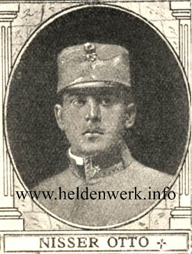 Otto Nisser wurde 1892 in Saaz in Böhmen geboren. Zu Kriegsbeginn wurde er, von seinem Zivilberuf als Lehrer in Trautenau, als Kadett der Reserve zum Landwehr-Infanterie Regiment Nr. 3 einberufen. Am 20. Oktober 1914 wurde er vom Kadetten der Reserve zum Fähnrich der Reserve (Rang 602 vom 1.11.1914) befördert Am 25. März 1915 ging er mit seinem Zug im heftigsten Feuer schneidig vor, um die vom überlegenen Gegner angegriffene Schwarmlinie des Nachbarregiments zu verstärken. Durch sein energisches, todesverachtendes Eingreifen im entscheidenden Augenblick trug er wesentlich zum Zusammenbruch des russischen Angriffs bei. Für diese Tat wurde er mit der Silbernen Tapferkeitsmedaille 1. Klasse ausgezeichnet. Während der Kämpfe am Dniester deckte er am 11. Mai 1915 bei Horodenka mit zwei Maschinengewehren den Rückzug mit heldenmütiger Entschlossenheit. Durch sein zähes Ausharren und seine unerschütterliche Kaltblütigkeit war es möglich, dass die Abteilungen ohne nennenswerte Verluste zurückkamen. Fähnrich Nisser selbst harrte bis zum letzten Augenblick mit opferwilligem Heroismus aus und wehrte zwei übermächtige Kavallerieattacken bravourös ab. Hierbei fand er den Heldentod. Sein kühnes Verhalten wurde mit der posthumen Zuerkennung der Goldenen Tapferkeitsmedaille geehrt. © Jörg C. Steiner, Wien |