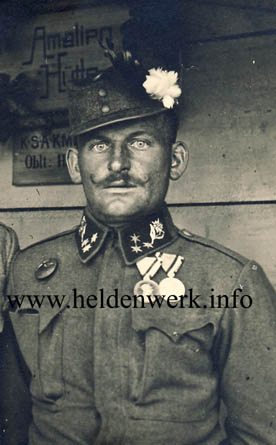 Georg Nussbaumer wurde am 24. April 1891 in Krumbach (Vorarlberg) geboren und auf den Namen Johan Georg römisch katholisch getauft. Im seinem weiteren Leben benutzte er allerdings nur seinen zweiten Vornamen "Georg". Sein Vater Eduard Nussbaumer war gelernter Schlosser, seine Mutter Maria Victoria eine geborene Wippen. Zu Kriegsbeginn wurde er ins Kaiserschützen Regiment Nr. IV eingezogen und aufgrund seiner hervorragenden Ergebnisse als Schütze der MG-Abteilung zugeteilt. Bereits Mitte Oktober 1914 wurde der Kaiserschütze im Gefecht durch einen Schuss in die linke Hand und einen in den rechten Oberarm schwer verwundet. Er verbrachte insgesamt 4 Wochen im Wiener Rudolfspital, der Mittelfinger seiner linken Hand konnte jedoch nicht gerettet werden. Es folgten mehrere Wochen Genesungsurlaub in seiner Vorarlberger Heimat. Mit dem Kaiserschützen Rgt. Nr. III ging er abermals ins Feld und wurde schließlich zum Unterjäger (Korporal) befördert. Schließlich wurde er dem Landsturm Baon 165 zugeteilt, wo er in dem Korporal Georg Buchensteiner des Inf. Rgt. Nr. 59 einen kongenialen Partner fand. In der Nacht vom 20. auf den 21. Februar 1917 erwarben sich diese beiden Korporale die Goldene Tapferkeitsmedaille. Die Lokalzeitung Vorarlberger Volksfreund publizierte darüber: "Unterlangenegg - der Kaiserschützen-Unterjäger Joh. Georg Nußbaumer von hier vollführte vor einigen Tagen mit einem anderen Unterjäger (gemeint ist wohl Korp. Buchensteiner) einen mutigen nächtlichen Patrouillengang. Sie erstiegen in tiefem Schnee eine feindliche Kuppe (eine Stunde Wegzeit), lagen 3 Stunden in der Kälte auf Lauer, warteten den Postenwechsel ab, schossen den neuen Posten nieder, erkletterten das Hindernis und warfen aus gedeckten Gräben herbeieilende Italiener mit dem Bajonett in ihren Unterstand zurück. In denselben warfen sie Handgranaten, deren Zündvorrichtung sie infolge erstarrter Finger mit den Zähnen abbissen, töteten einen Mann und nahmen einen Italiener gefangen. Die alarmierte feindliche Hauptstellung überschüttete sie mit Infanteriefeuer, von der Flanke kam Maschinengewehrfeuer, und trotzdem gelang ihnen, sich und den Gefangenen, der verwundet war, hinter einen Felsen in Sicherheit zu bringen, wo sie den Rückzug antraten. Als Lohn dieser Heldentat erhielten diese Tapferen eine Prämie von je 100 K und die 'Goldene'. welche ihnen am 20. ds. Mts. in feierlicher Weise vom Herrn Obersten des Standortes überreicht wurde. Außerdem wurden beide Helden zu Zugsführern befördert. Möge ein gütiges Geschick auch in Zukunft unseren tapferen Mitbürger erhalten und ihm eine glückliche Heimkehr gewähren." Am 9. Mai 1917 erhielt Zugsführer Georg Nussbaumer die Silberne Tapferkeitsmedaille 1. Klasse verliehen. Leider konnte bis dato keine dazugehörige Waffentat ermittelt werden außer die kurze Nachricht im Vorarlberger Volksfreund: "... Joh. Georg Nussbaumer wurde anläßlich der Maioffensive gegen die Welschen mit der großen 'Silbernen' ausgezeichnet ..." Am 12. Juni 1917 berichtete der Vorarlberger Volksfreund abermals über das Team Georg Nussbaumer - Georg Buchensteiner: "Zwei heldenmütige Zugsführer - Die erst kürzlich mit der goldenen und großen silbernen Tapferkeitsmedaille ausgezeichneten Zugsführer Johann Georg Nussbaumer von Unterlangenegg und Georg Buchsteiner, Jägerbauerssohn in Flauchau bei Radstadt in Salzburg, erwarben sich durch eine gelungene, mutige Patrouillen-Unternehmung am 23. April, in der sie mit noch vier Mann nachts in eine welsche eindrangen, dieser einen Verlust von fünf Toten und zwei Verwundeten beibrachten, außerdem noch wertvolle Aufschlüsse über die Feindeslage ermöglichten, ohne selbst den geringsten Verlust zu erleiden, die dritte Kriegsauszeichnung. Dem Führer der Patrouille, Joh. Georg Nussbaumer, wurde zum zweiten Male die große Silberne, seinem ebenso schneidigen Waffenbruder Georg Buchsteiner die kleine Silberne zuerkannt. ..." In weiterer Folge wurden beiden noch das Karl-Truppen-Kreuz und die Verwundetenmedaille zuerkannt. Laut Auskunft von Georg Buchsteiner an den Ring der Goldenen Tapferkeitsmedaille, bestätigt durch einen entsprechenden Eintrag im Taufregister seiner Heimatgemeinde verstarb Johann Georg Nussbaumer am 12. Oktober 1918. Anmerkung: Vergleiche auch Artikel über Georg Buchsteiner! © Jörg C. Steiner, Wien |
