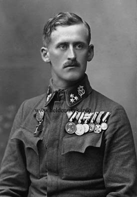 Matthias Osterer kam am 27. Juni 1893 in Wörgl-Boden in Tirol zur Welt. Nach der Pflichtschule war er, bis zu Beginn des Weltkrieges, bei der Firma Perlmoser AG in Kirchbichl als einfacher Fabriksarbeiter beschäftigt. Im Jahre 1914 rückte er zum k.u.k. Infanterie-Regiment Nr. 59 nach Salzburg ein, wurde jedoch infolge „physischer Schwächlichkeiten“ nach kurzer Zeit vom Wehrdienst zurückgestellt und kehrte vorerst als Superarbitrierter wieder nach Hause zurück. Durch die enormen Anfangsverluste, rund eine Million Mann im ersten Kriegsjahr, konnte natürlich im weiteren Kriegsverlauf auf solche „Schwächlichkeiten“ keine Rücksicht mehr genommen werden und so wurde Matthias Osterer im Mai 1915 telegraphisch nach Wels zum Landesschützenregiment Nr.I einberufen. Nach kurzer Ausbildung ging er mit der 7. Feldkompanie an die Südfront ab. Bereits im April 1916 erwarb er sich als Patrouilleführer (=Gefreiter) die Silberne Tapferkeitsmedaille 2. Klasse als erste Auszeichnung. Im November 1916, diesmal bereits Unterjäger (=Korporal), die Wiederholungsspange zu dieser Medaille. Insgesamt errang Matthias Osterer in seiner 37 Monate dauernden Kriegsdienstleistung alle Tapferkeitsmedaillen, von der Bronzenen bis zur Goldenen sowie die sogenannte „Kleine Silberne“ dreimal. Gab es irgendwo in seinem Abschnitt ein kritisches Unternehmen durchzuführen, so war stets auch Zugsführer Osterer zur Stelle, meldete sich freiwillig und wurde oft als Patrouillen- oder Sturmtruppkommandant eingesetzt. Alle übernommenen Aufgaben führte er schneidig und meist erfolgreich durch. Beim Angriff auf den Monte Fontana secca, südwestlich von Feltre, am 21. November 1917 tat sich Zugsführer Matthias Osterer wieder in besonderer Weise hervor. Mit seiner Sturmpatrouille überraschte er die feindliche Stellung, überwältigte die Besatzung und rollte mit Handgranaten die gesamte Stellung auf. Verzweifelt wehrten sich die Insassen des italienischen Stützpunktes, doch schließlich machte Osterers Sturmtrupp 120 Gefangene und erbeutete überdies drei feindliche Maschinengewehre. Den sofort einsetzenden Gegenangriff wehrte er mit wenigen Leuten ab, indem er sich mit erbeuteten italienischen Handgranaten verteidigte. Für diese erfolgreiche Waffentat erhielt Zugsführer Osterer die Goldene Tapferkeitsmedaille. Nach Kriegsende verblieb Zugsführer Osterer bei der Volkswehr vorübergehend im Dienst, doch erkannte er rasch, dass dort keine Zukunft für ihn möglich war. Matthias Osterer kehrte also wieder in sein ziviles Leben in Wörgel zurück und begann wieder bei seiner alten Firma in Kirchbichl zu arbeiten. Nach den harten Kriegsjahren folgten nun, aufgrund der wirtschaftlichen Lage, die entbehrungsreichen Nachkriegsjahre, die letztlich ihren Tribut forderten. Matthias Osterer erkrankte schwer und musste über zwei Jahre das Bett hüten. Am 25. Februar 1930 wurde er von seinem schweren Leiden erlöst. Die Beerdigung erfolgte unter militärischen Ehren, zahlreiche Kameraden der Kaiserschützen, mit Fahne und Ehrenhorn, gaben ihm das letzte Geleit. © Jörg C. Steiner, Wien |