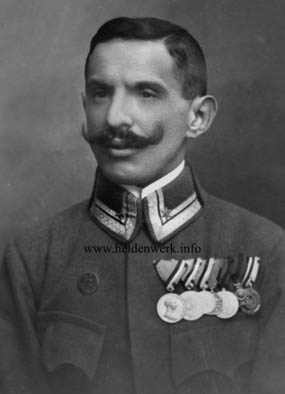 Rudolf Schwemberger wurde am 5. Juli 1885 in Bozen geboren. Nach Besuch der Volksschule in Brixen übersiedelte seine Familie nach Hall in Nordtirol, wo er seine Ausbildung zu Ende führte um schließlich das Handwerk eines Waffenschmiedes zu erlernen. Diesen Beruf übte er auch ab 1903 in Hall aus, bis er 1906 zum 2. Regiment Tiroler Kaiserjäger nach Brixen eingezogen wurde, wo er bis 1909 seinen Wehrdienst ableistete. Im Februar 1910 trat er in den Staatsdienst ein und zwar bei der k.k. Finanzwache in Kufstein, wo er bis Kriegsbeginn Dienst tat. Gleich im August 1914 wurde Rudolf Schwemberger als Reserve-Zugsführer in sein Stammregiment einberufen und ging im Verbande der 16. Feldkompanie nach Galizien an die russische Front ab. In rascher Folge erwarb er im Februar 1915 zuerst die Silberne Tapferkeitsmedaille 2. Klasse und danach jene 1. Klasse. Eine schwer, im Felde zugezogene Krankheit zwang ihn jedoch von Mai bis Dezember 1915 zu einem Spitalsaufenthalt in Beneschau. Diese Gelegenheit nützte Rudolf Schwemberger um am 6. September 1915 Frau Anna Hanusch zu ehelichen, die ihm in weiterer Folge acht Kinder schenken sollte. Nach seiner Genesung rückte er im Frühjahr 1916 wieder zu seinem Regiment ein, das mittlerweile an die Südfront verlegt worden war. Hier wurde Rudolf Schwemberger, der mittlerweile zum Stabsoberjäger befördert worden war, als Zugskommandant im Rahmen der 7. Feldkompanie eingesetzt. In dieser Funktion konnte er auch im Oktober 1917 die Goldene Tapferkeitsmedaille erringen. Im entsprechenden Belohnungsantrag heißt es wie folgt: „Meldete sich am 11. Oktober 1917 freiwillig zu einer wichtigen Rekognoszierung der feindlichen Stellung auf der Nordkuppe des Monte Piano. Er führte mit Zugsführer Hütter derselben Kompanie seine Aufgabe in hervorragend schneidiger Weise auf nächste Distanz vom Feinde durch. Die Unternehmung hatte vollen Erfolg und brachte wichtige Aufschlüsse über die feindlichen Stellungen. Kurz vor Einrücken wurde er durch eine Handgranate derart schwer im Gesicht verwundet, dass er höchstwahrscheinlich sein Augenlicht verlieren wird. Stabsoberjäger Schwemberger ist einer der Besten und Bravsten des Baons. Als Kommandant in höchsten Grade energisch, selbständig, stets bereit zu gefahrvollen Patrouillen, unermüdlich im Dienste, mit Liebe und Seele Soldat, hat er während des Krieges stets mit voller Hingabe seinen Dienst erfüllt und immer mehr geleistet, als es Gehorsam und Soldatenpflicht verlangen.“ Die genannte schwere Verwundung wurde zuerst in Innsbruck, dann in Kufstein behandelt und die Ärzte konnten schließlich den Verlust des Augenlichtes verhindern, für Rudolf Schwemberger bedeutete es allerdings einen, von Mitte Oktober 1917 bis Anfang Jänner 1919 andauernden, Spitalsaufenthalt! Während dieser langen Spitalspflege erhielt er das Karl-Truppen-Kreuz, die Verwundetenmedaille mit zwei Bandstreifen, wurde zum Reserve-Offiziersstellverteter befördert und es wurde ihm natürlich die Goldene Tapferkeitsmedaille überreicht - ohne Verleihungsfeier, einfach so gegen Revers auf die Hand! Zeitlebens ist Offiziersstellvertreter Schwemberger über diese Behandlung verärgert und zutiefst gekränkt. Möglicherweise ein Grund dafür, dass er die ihm übergebene Tapferkeitsmedaille mit dem Bildnis von Kaiser Karl niemals trägt, sondern immer ein Ersatzstück mit dem Bildnis von Kaiser Franz Joseph. Nach seiner Genesung kehrte er wieder in den Dienst bei der Zollwache zurück, wo er schon bald Leiter des Straßenzollamts in Kiefersfelden wurde. Nach dem Anschluss Österreichs ans Großdeutsche Reich wurden, anlässlich des 25sten Jahrestages der Schlacht von Tannenberg am 27. August 1939, viele Träger höchster Tapferkeitsauszeichnungen ehrenhalber zu Offizieren in der deutschen Wehmacht befördert. Zollwach-Inspektor Rudolf Schwemberger war einer der wenigen, dem diese Ehre nicht zu teil wurde. Offenbar hatten die neuen Machthaber Zweifel an seiner politischen Gesinnung, die zwar nicht ausreichten ihn, wie andere Träger der Goldenen, zu internieren oder anderer Repressalien auszusetzen, aber für unbedenklich konnten sie ihn auch nicht erklären. Rudolf Schwemberger blieb bis zu seiner Pensionierung als Zollwach-Gruppeninspektor im Jahre 1950 Zollamtsleiter in Kiefersfeld. Seine Ruhejahre verbrachte er mit seiner Frau in Innsbruck. Am 9. November 1964 verstirbt Rudolf Schwemberger in Innsbruck, sein Grab befindet sich am Pradler-Friedhof. © Jörg C. Steiner, Wien |