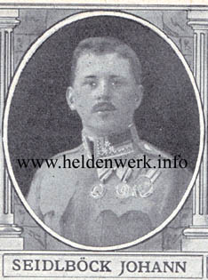 Johann Seidlböck wurde am 22. Februar 1885 (getauft am 8. März) in Guntramsdorf bei Wien als Sohn des Ehepaars Johann und Leopoldine (geb. Lahner) geboren. Sein Vater was Schmiedgeselle, er erlehrte das Handwerk eines Spenglers. Nach Ableistung des Grundwehrdienstes entschloss er sich die Karriere eines Berufsunteroffiziers einzuschlagen und fand Verwendung als Zugskommandant im k.k. Landewehr-Infanterie-Regiment „Wien“ Nr. 1, welches später im Weltkrieg in Schützen-Regiment Nr. 1 umbenannt worden ist. Mit diesem Regiment ging er unmittelbar nach Kriegsausbruch an die Russlandfront ab wo er in rascher Folge, bereits in den ersten Gefechten, die Goldene (publiziert 7.1.1915) und die Silberne Tapferkeitsmedaille 1. Klasse (publiziert 20.11.1914) erwarb. In der Publikation des Kriegspressequartiers liest sich das so: „Seidlböck Johann, Stabsfeldwebel des k.k. Landwehrinfanterieregiments Nr.1 geboren 1885 in Guntramsdorf bei Wien. Im Gefechte am 26. August 1914 bei Zamość in Russisch-Polen verstand er es, als Zugskommandant im heftigsten feindlichen Flankenfeuer seine Mannschaft durch zwei Stunden zum Ausharren am gefährdeten Flügel zu bewegen. In der folgenden Nacht sammelte er trotz großer Erschöpfung Versprengte und formierte sie in geordnete Verbände. Als er am 31. August 1914 seinen Zug mit großer Todesverachtung zum Angriff auf Dub vorführte, wurde er schwer verwundet. Nach Genesung zum zweitenmal ins Feld abgegangen, geriet er bei einem Sturm durch sein ungestümes Vorwärtsdrängen mit 5 Infanteristen in Gefangenschaft. In einem günstigen Augenblick entwaffnete er die in seiner Nähe befindlichen 20 Russen und nahm sie gefangen. Er wurde zweimal ausgezeichnet und nun schmücken die große silberne und die goldene Tapferkeitsmedaille seine Heldenbrust.“ In der Ausgabe vom Dienstag den 13. Juli 1915 berichtete die Illustrierte Kronen-Zeitung über "Offiziers-Stellvertreter Hans Seidelböck vom Landwehr-Infanterie-Regiment Wien Nr.1" (Name konsequent falsch geschrieben!) inklusive einer, für diese Zeitung typischen Portrait-Zeichnung, wie folgt: "Wir zeigen heute das Bild eines hochverdienten Unteroffiziers des Wiener Landwehrregiments Nr. 1, des Offiziers-Stellvertreters Herrn Hans Seidelböck, dessen Name unseren Lesern aus mehreren hübsch gezeichneten Feldpostkarten, die in der 'Kronen-Zeitung' veröffentlicht wurden, in bester Erinnerung ist. Offiziersstellvertreter Seidelböck und Rechnungsunteroffizier Josef Jarausch haben uns wiederholt aus dem Felde flotte Zeichnungen gesandt, die von dem ausgezeichneten Geiste, der bei unseren Wiener Landwehrregimentern herrscht, Zeugnis ablegt. Nun ist Offiziersstellvertreter Seidelböck als Verwundeter in Wien in Spitalspflege. Es wird unsere Leser sicherlich interessieren, einiges aus den Erlebnissen des wackeren Offiziersstellvertreter zu erfahren, der als längerdienender Unteroffizier alle Kämpfe des Landwehr-Inf.-Rg. Wien 1 mitmachte und im Sturmjahre des Weltkrieges mehrfach befördert und ausgezeichnet wurde. Herr Seidelböck wurde zuerst vom Feldwebel zum Stabsfeldwebel und jetzt vom Stabsfeldwebel zum Offiziersstellvertreter ernannt und für seine heldenmütigen Leistungen mit der silbernen Tapferkeitsmedaille erster Klasse und dann mit der goldenen Tapferkeitsmedaille ausgezeichnet. Er schildert eine Erlebnisse, als er zum drittenmal im Feld war, in folgender anschaulicher Weise: Am 15. Juni wurde ich zum viertenmal verwundet und kam ins Reservespital 3 in Budapest, wo wir am 29. Juni durch den Besuch der Erzherzogin Augusta ausgezeichnet wurden. Die Verwundeten wurden mit Bäckereien, Rauchrequisiten, Karten und mit verschiedenen anderen Sachen beteilt; auch ich wurde bedacht und angesprochen. 'Wie sprechen Sie?' fragte mich die Erzherzogin. 'Kaiserliche Hoheit, ich bin ein Wiener.' Auch wurde ich von einem Offizier vorgestellt, daß ich Besitzer 'der Goldenen' bin, worauf mir ihre kaiserl. Hoheit sagte 'Sehr brav und tapfer!' Ich antwortete: 'Wie immer, die Wiener lassen sich nicht zurückstellen.' Sie fragte weiter ob ich verwundet sei? Ich sagte, Ja, zum viertenmal. Auch als ich zum drittenmal im Felde war, zeigte ich, daß ich der Alte geblieben bin. Vom 9. auf den 10. Juni hatte ich neuerdings einen hitzigen Tag. Wir lagen in einem Graben, der noch zum Teil von den Russen besetzt war. Die Russen setzen alles daran, den Graben uns wieder zu entreißen und griffen meinen Zug mit 3 Maschinengewehren an, ebenso wurden von ihnen Minenwerfer und Handgranaten verwendet, auch griff Infanterie an. Distanz war 100 Meter und immer näher kamen sie. Wir empfingen sie mit Handgranaten, das Gefecht hatte seinen Höhepunkt erreicht und die Russen schrien: 'fäerli, fäerli' (Sturmgeheul der Russen), aber sie wagten sich nicht ganz vor. Da ich am Beobachtungsposten stand und von dort aus Handgranaten schleuderte, rief ich kräftige Heilrufe und Hoch Österreich zurück. In nächster Nähe stand Herr Fähnrich R., der alles mit ansah und mir befahl, mich zu schonen und zu decken. Ich ging aber nicht zurück, da ich die Russen nicht aus den Augen lassen wollte, faßte auch den festen Entschluß, den Schützengraben nicht lebend zu übergeben und rief meiner Mannschaft zu: 'Zeigt, daß ihr Wiener seid!' Es brach der Tag an und die Russen mußten abziehen. Ich machte dann noch weitere Angriffe mit und wurde am 15. Juni durch einen Brustschuß verwundet, wobei ich innere Verletzungen davontrug, auch steckt das Geschoß noch in mir. Befinde mich jetzt in Wien im k.u.k. Reservespital Nr. 16. Ich muß hier noch folgende Tatsache erwähnen: Vor meinem Abgang hatte ich mich auch beim Herrn Regimentsarzt Dr. Foramitti empfohlen, der mir zu weiterem Erfolge gratulierte, worauf ich sagte: 'Diesmal, Herr Regimentsarzt, komme ich mit einer Kugel im Leib zurück, um vom Herrn Regimentsarzt operiert zu werden.' Und es kam auch so, die Kugel steckt in der Brust und wird in zirka fünf Wochen durch Herrn Regimentsarzt Foramitti operati